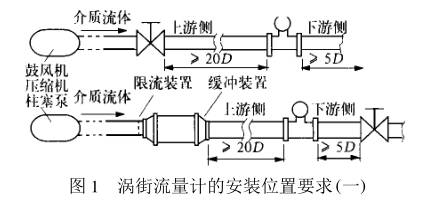 (1) 涡街流量计对前后直管段的一般要求是 : 前 20 D , 后 5 D( D 为相连工艺管道内径) ,阀门一般设计在流量计的下游侧。