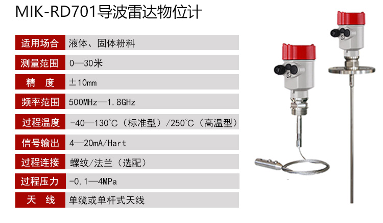 MIK-RD70雷达物位计天线发射极窄的微波脉冲,这个脉冲以光速在空间传播,遇到被测介质表面,其部分能量被反射回来,被同一天线接收。发射脉神与接收脉冲的时间间隔与天线到被测介质表面的距离成正比。由于电磁波的传播速度极高,发射脉神与接收脉神的时间间隔很小(纳秒量级)很难确认,MIK—RD70导波雷达物位计采用种特殊的解调技术,可以准确识别发射脉神与接收脉神的时间间隔,从而进一步计算出天线到被测质表面的距离。